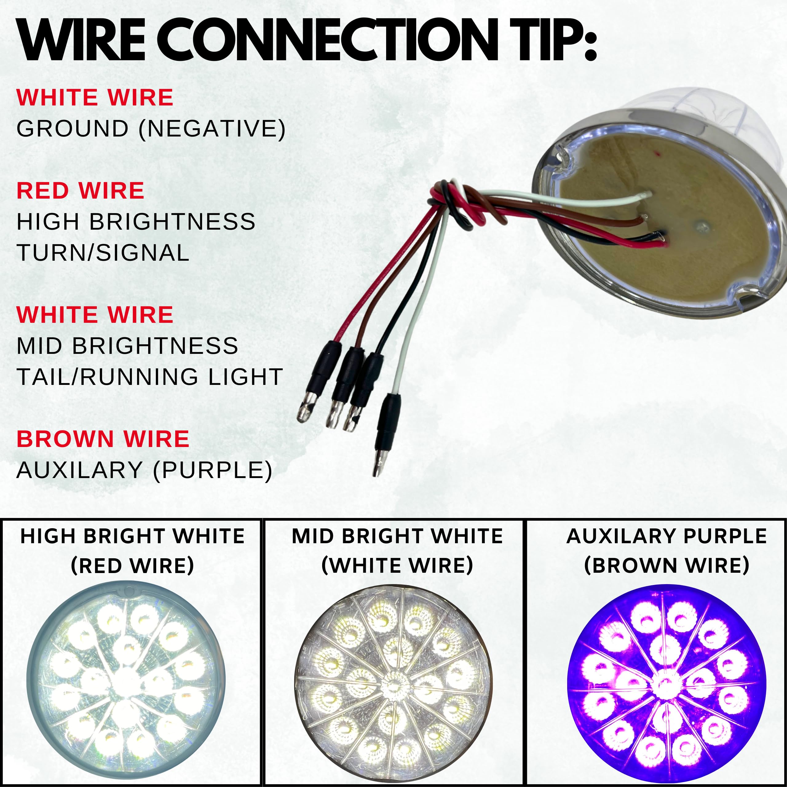 【Simple Wiring】The white wire is ground, black wire is White LED low brightness and function as Marker Lights; the red wire is White LED high brightness and function as Turn Signal Lights; the yellow wire is Purple Light for Auxiliary Light. Can also function as Interior Dome Watermelon Lights