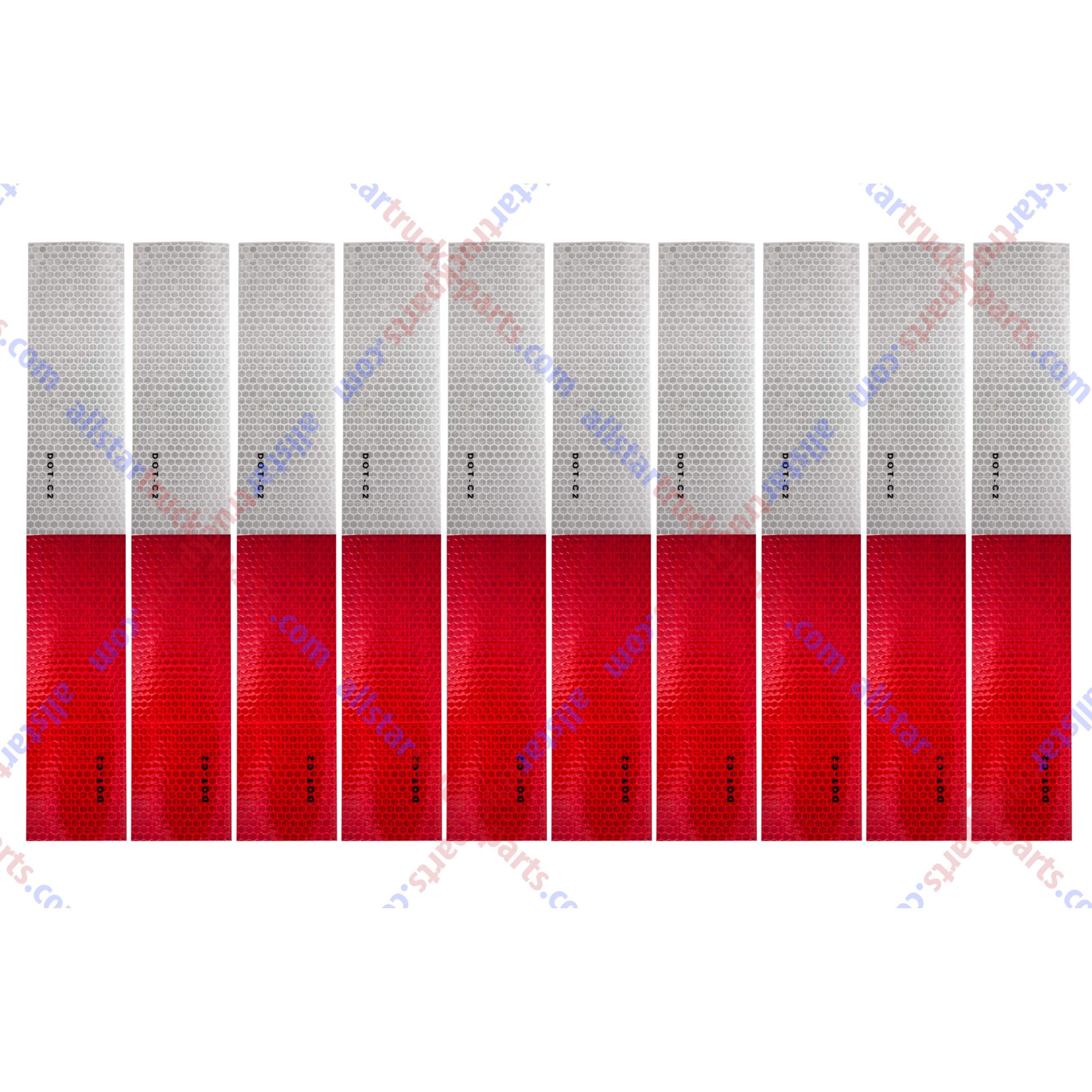2" Width x 12" Length Strips (10 Strips Total) REFLECTIVE CONSPICUITY TAPE 6" RED/ 6" WHITE DOT-C2 APPROVED ULTRA REFLECTIVE HONEYCOMB CRYSTAL PATTERN Meets DOT C2/SAE requirements Features: 6" Red / 6" White - 2" Width x 12" Length Strips (10 Strips Total) High Quality - Ultra reflective Honeycomb (Hexagonal) Crystal Pattern Super Self Adhesive DOT FMVSS C2/SAE Requirements Super long life span Use on any surface that needs to be seen! Including: Trailers Campers Cars Bicycle Racks Boat Trailers Church Vans Garden Equipment Warehouses Motorcyle Trailers Toys Camping Trailers Bicycles Boats School Bus Farm Equipment Parking Lots Road Barriers and Gates