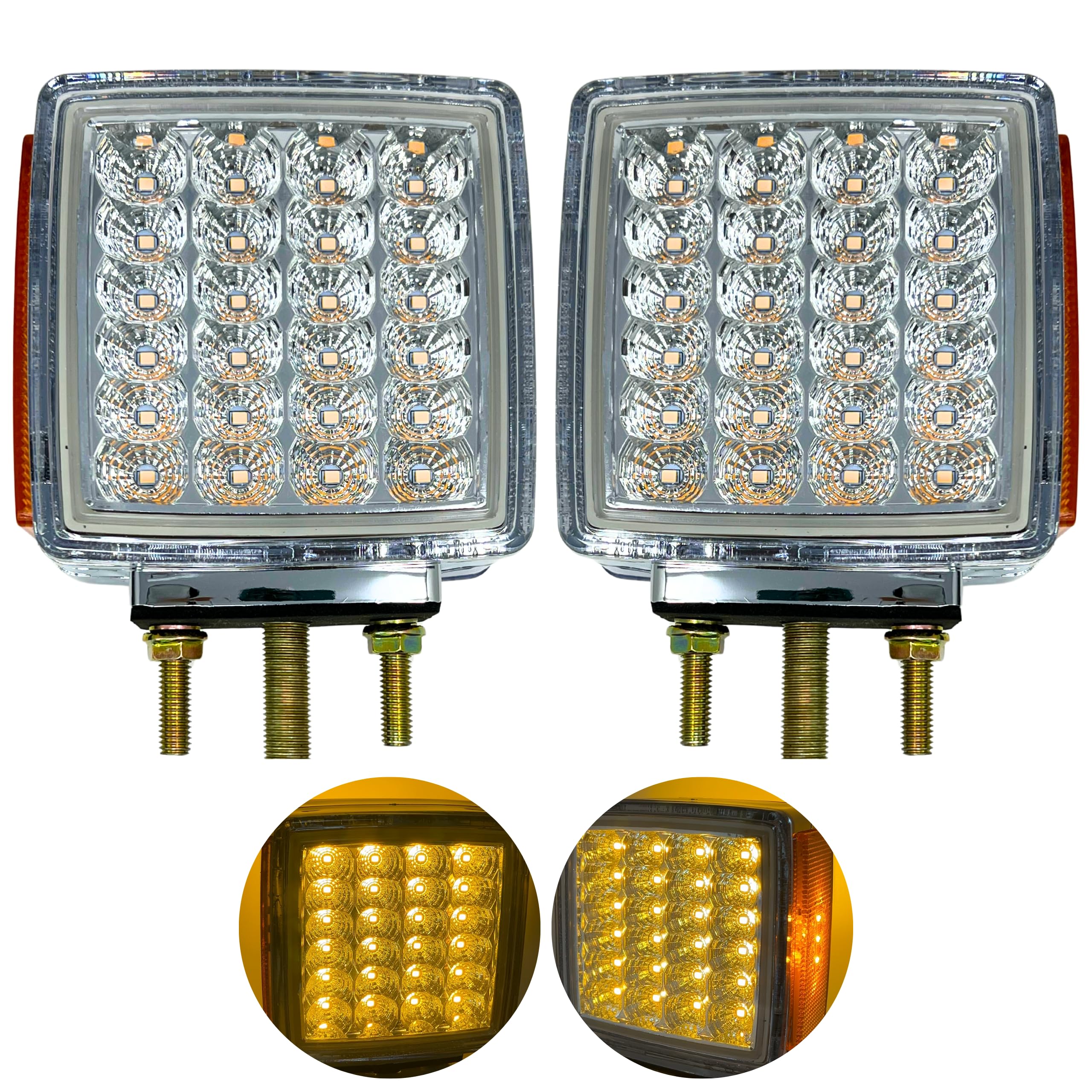 QTY 2 (Left and Right) SQUARE 51 LED DOUBLE FACE (AMBER/AMBER) STUD MOUNT PEDESTAL LIGHT STOP/TURN/TAIL FUNCTIONING WITH THREE WIRES CONNECTED Dimensions: 4.53" x 4.53" x 2.36" Features: 51 Total LED's : 24 Amber LED's , 24 Amber LED's, and 3 Amber Side Marker LED's 51 Great replacement for incandescent lights No bulbs to replace No brittle filaments Sealed Housing Poly Carbonate Lens and Chrome Housing Mounting - 2x Screw Base Lifespan > 50,000 Hours Voltage : 12V Meets DOT/SAE Requirements Made by OE approved and ISO certified maufacturers with quality meeting OEM standards Wires connection Tip: * White wire with O-Ring terminal is Ground wire * White + Black: All LEDs light up in half brightness. * White + Red: Back & Front LEDs light up in full brightness.