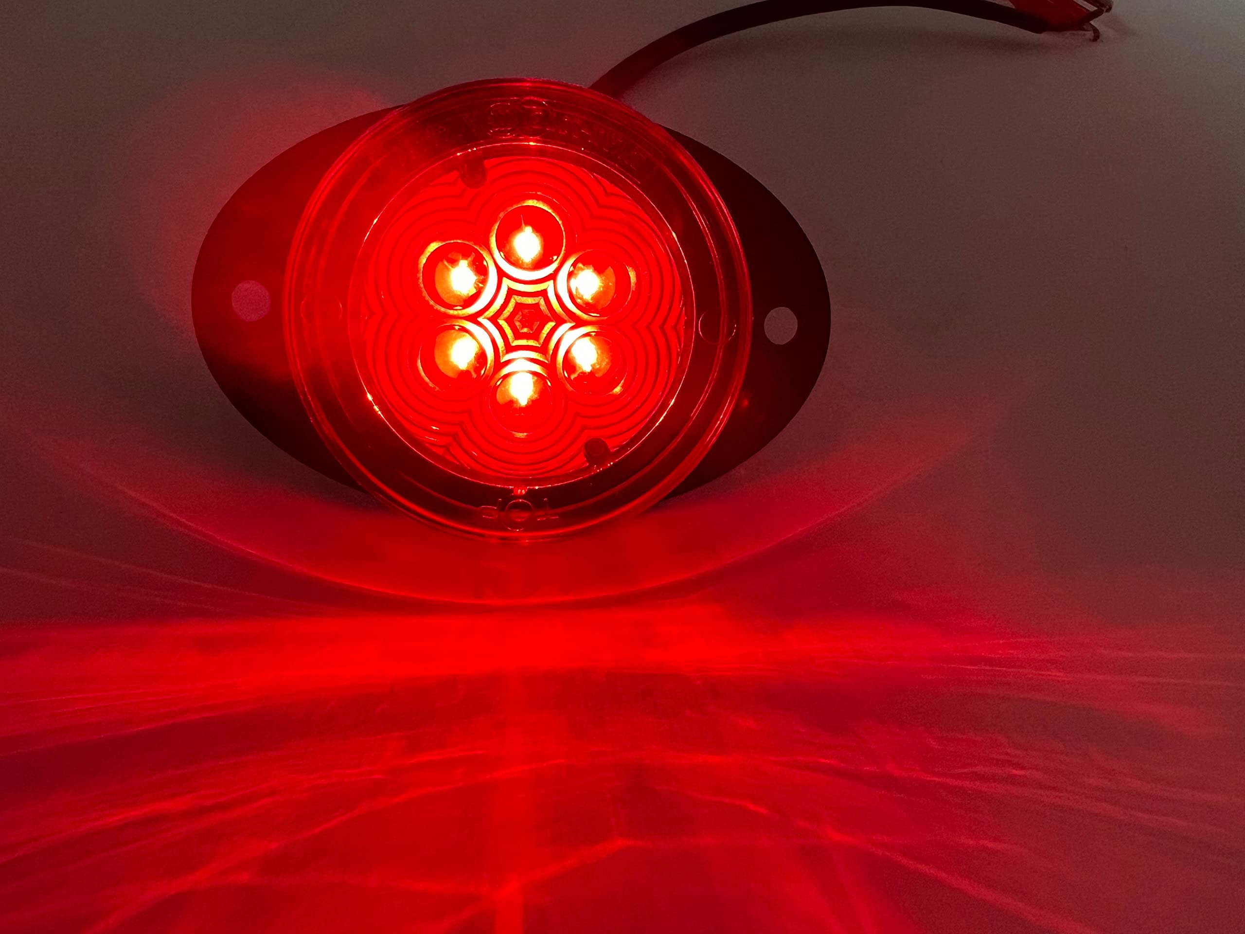 Red 6 LED, 2.5" round, Side Marker Clearance Lights Great replacement for incandescent lights, no bulbs to replace. Sealed housing and lens (waterproof seal), Includes 2 wire pigtail plug and rubber grommet for easy connection! 13 Red LEDs (Light Emitting Diodes) Meets DOT FMVSS 108/SAE Requirements