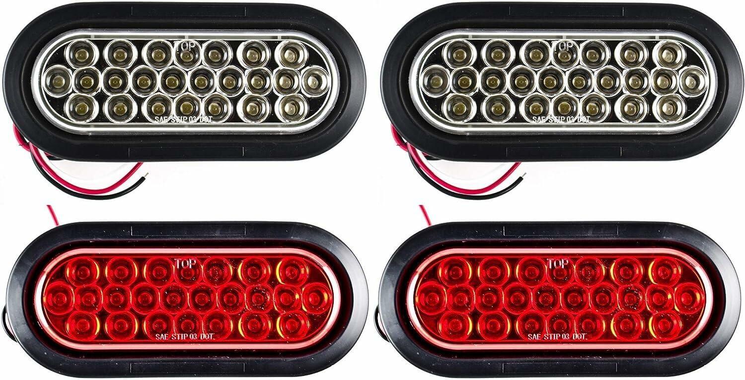 Size:24 LED Model | Color:2 Red + 2 White No Wasted Time When you’re deciding if you should upgrade to LEDs, one major consideration is “time invested vs reward.” Let’s make it easy for you. Our lights are the industry standard 6” oval lights so no modification is needed to install them. The included grommet quickly locks your lights in place and the lights are direct, wire for wire, replacement for your dual filament stop/tail turn/parking lights (amber/red) and reverse lights (white). It doesn’t get easier than this. Standard Size, Non-Standard Abilities Do these features make the lights worth the small investment of time? Absolutely! 24 super-bright colored LEDs behind a diffused polycarbonate lens blow away standard bulbs and make you more visible and safe at night, in fog, and in the rain. And speaking of rain, our lights are IP67 submersible waterproof rated so you don’t have to worry about the weather or the lake. Yes, They Will Work for You Whether you're upgrading your tractor, trailer, these lights are the ideal choice. Even if you’re working in a tight space, like the back of a Wrangler, our 90° connector has you covered. And since our lights are SAE and DOT FMVSS-108 certified, you can be sure that they are a perfect fit and completely legal. What's Included? (2) 6" 24-LED Oval Tail Light - Red (1) 6" Oval Tail Light (1) 6" Oval Rubber Grommet (1) 3-Pin Connector (2) 6" 24-LED Oval Tail Light - White (1) 6" Oval Tail Light (1) 6" Oval Rubber Grommet (1) 3-Pin Connector